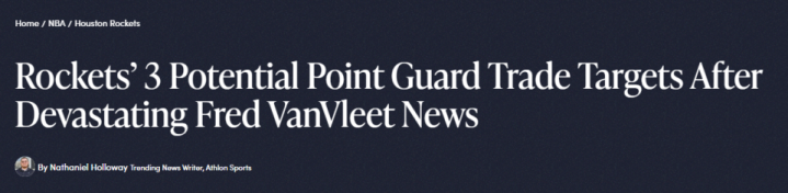 火箭队若不满足于寻找老将替补,而是希望引入球星级球员填补范弗利特空缺,亚特兰大老鹰队的特雷-杨将是潜在目标。