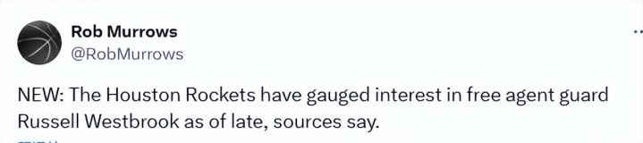 NBA记者Rob Murrows报道称,他的消息源透露,火箭最近已对自由球员威斯布鲁克表达兴趣。威少若加盟火箭,他将和前雷霆队友杜兰特、亚当斯重聚。需要强调的是,火箭受硬工资帽的限制,在用正式合同签人之前必须先通过交易腾出薪金空间。当然,他们还有其他选择,那就是直接通过交易引进控卫。