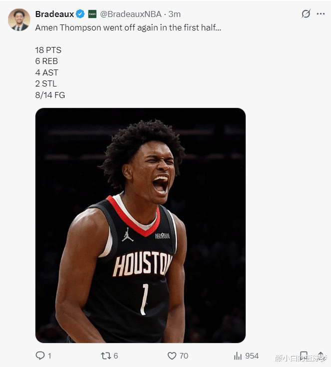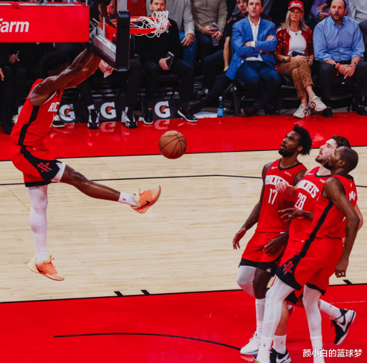 次节阿门打满了12分钟,8中4,三分1中0拿到8分4助攻3篮板1抢断,篮下有三次都是暴扣,他原本可以单节10分的,但快攻有一球他传给了手感不佳的杜兰特。半场阿门14中8拿到18分6篮板4助攻2抢断,他是火箭上半场发挥最出色的球员。